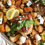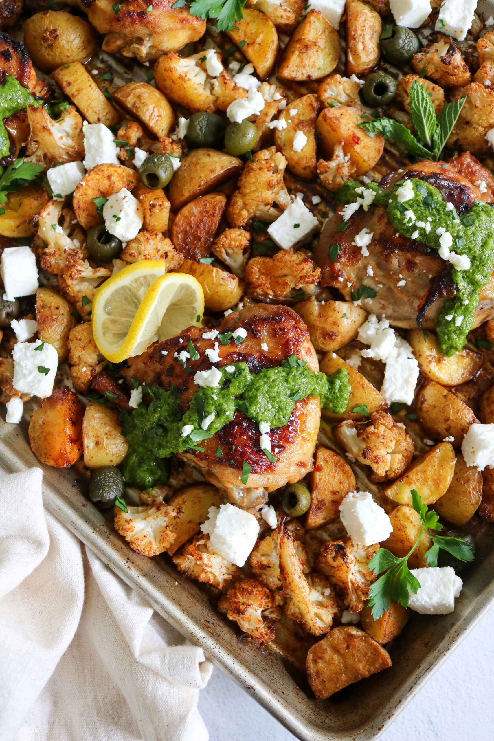- Before serving, crumble feta over top of chicken and vegetables. Serve with green sauce.